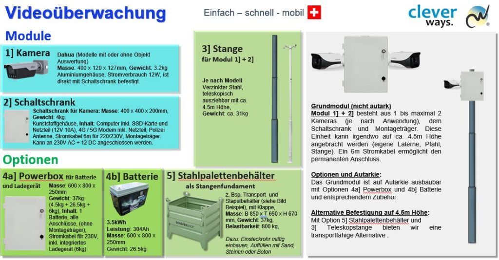 Mobile Videoüberwachung – schnell einsatzbereit: Das mit 1 bis 2 Kameras ausgerüstete mobile Videoüberwachungs-System ist schnell platziert und ohne langwierige technische Konfiguration sofort einsatzbereit. Dies gilt für jeden Standort, welcher 4G/5G Mobilnetzempfang hat.